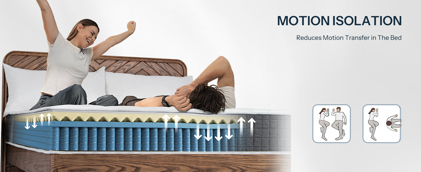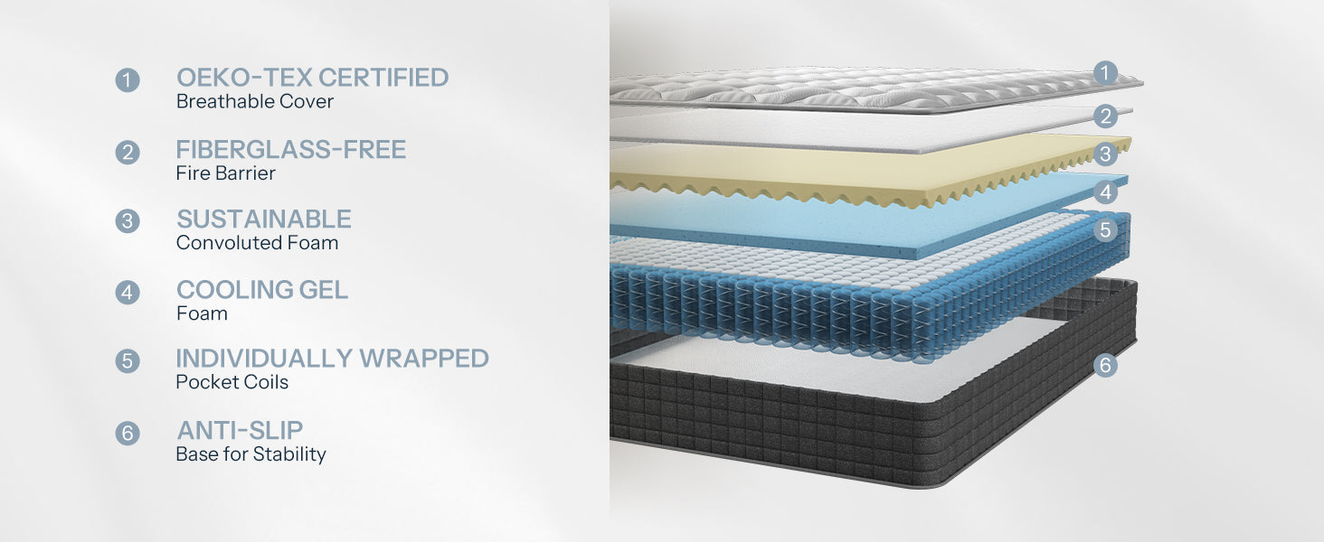 A cooling hybrid mattress designed for hot sleepers, combining pressure relief and individually wrapped pocket coil support in a spacious king size.